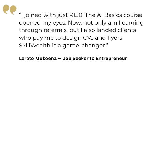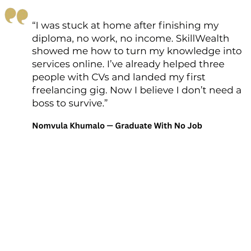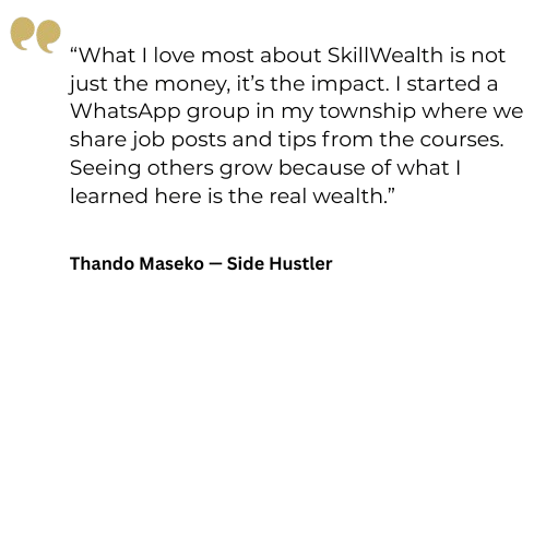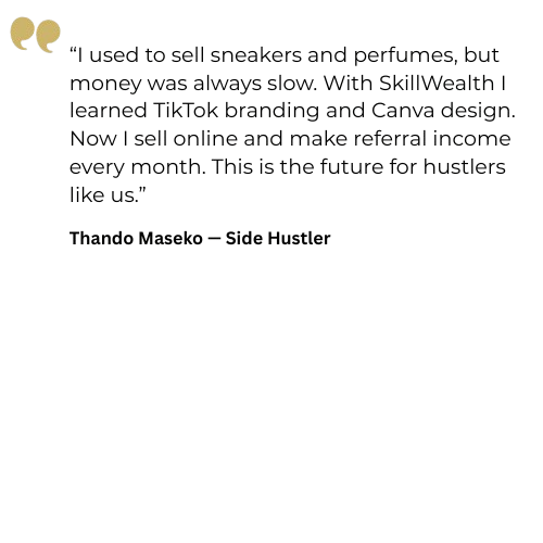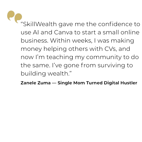 "SkillWealth gave me the confidence to start a branding business. Within weeks, I was making money helping others. I've gone from surviving to building wealth."